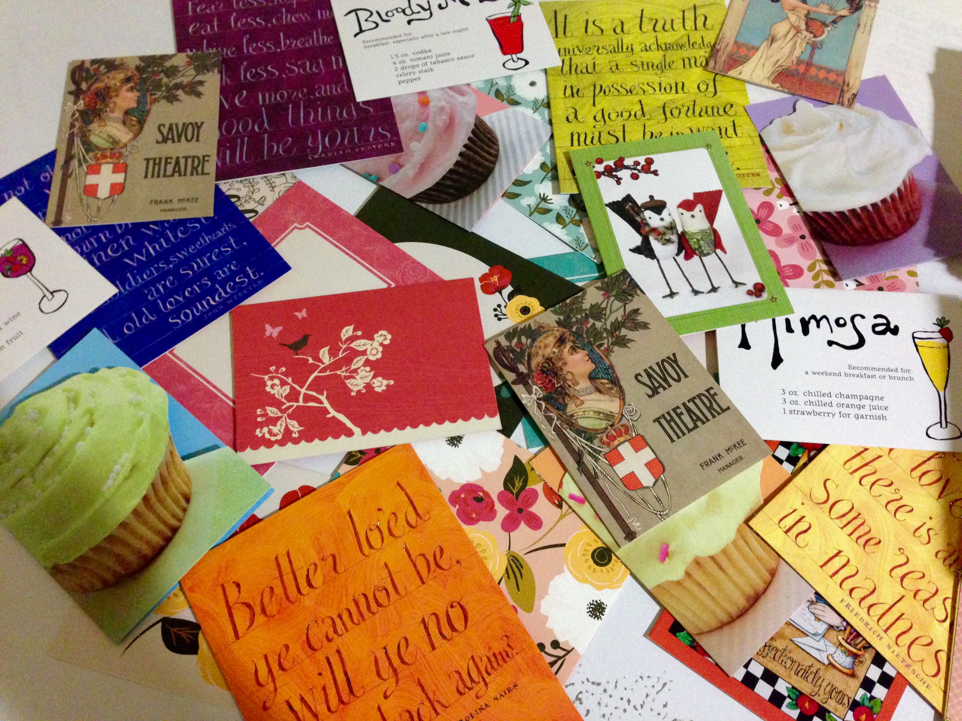 Well, it’s November and I’m kicking off two big projects: my handwritten note a day, and my first pseudo-NaNoWriMo. Oi! A quick survey of my stationary collection reveals that I could send thirty different cards–which includes variations on the same card; for example, four different cupcake cards!–to thirty different people probably twice over. I figured I’d have to send a duplicate here or there but, nope. So, with my stockpile sorted and no need to run out to buy more, we’re off!