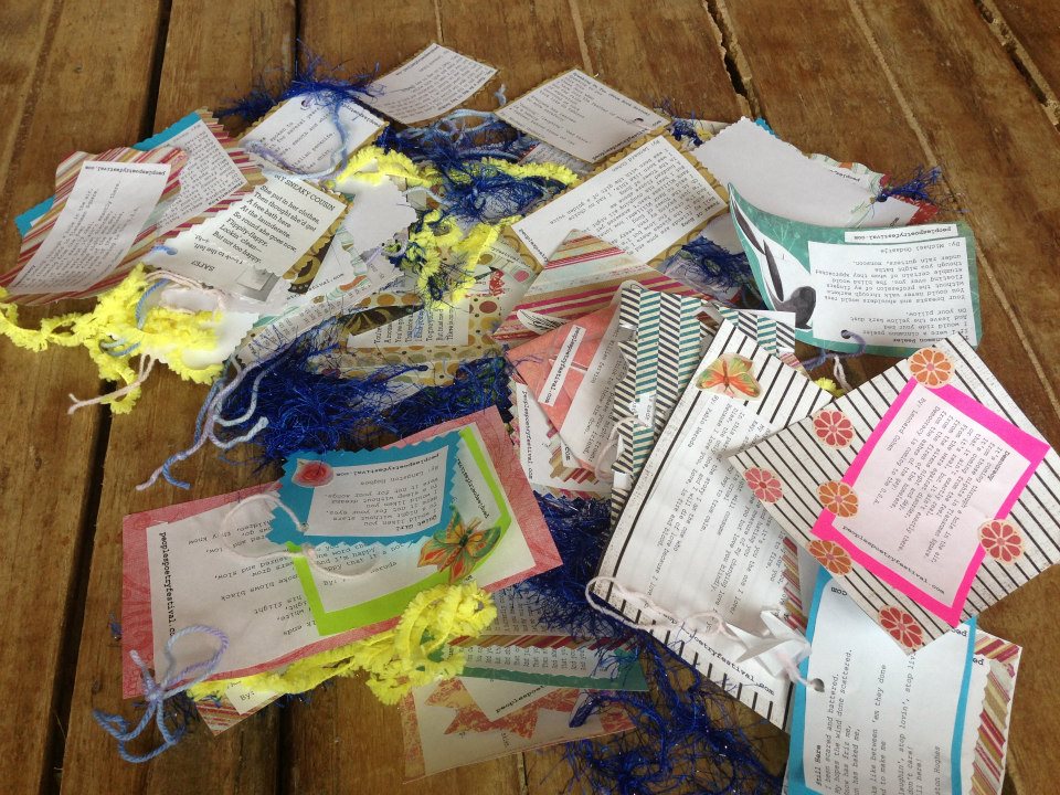 What is a “Poetry Bomb”? Like a yarn bomb, a poetry bomb is a covert piece of poetry–written on a piece of decorative card–and left around the city to share poetry with Calgarians! I first created poetry bombs as a way for poets and non-poets alike to come together, craft and share poetry as part of The People’s Poetry Festival. Occasionally, I still host poetry bomb-making workshops in coffee shops around the city and am pleased to be crafting hundreds of bombs for a second year for the Calgary Reads book sale.